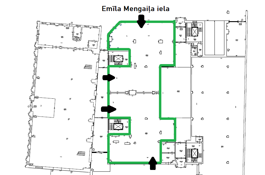 Komercplatības izvietotas 1. stāvā, ieeja no Melngaiļa ielas puses, rezerves ieeja no ēkas iekšpagalma puses.