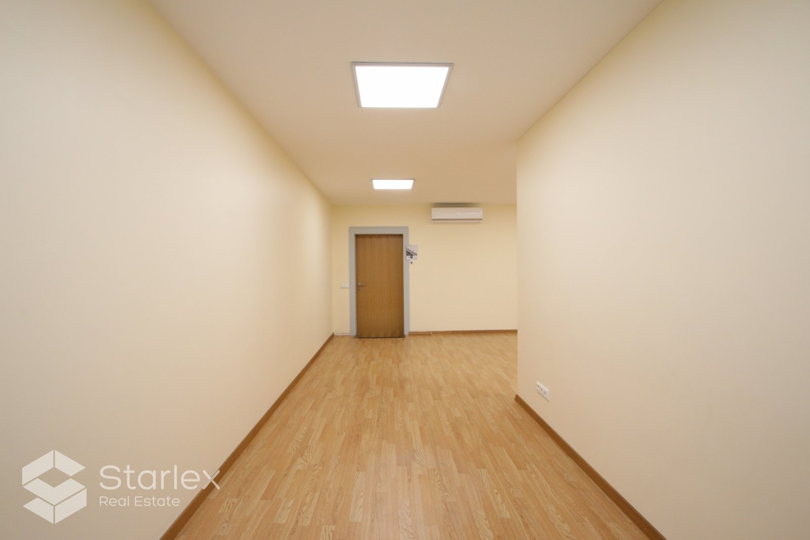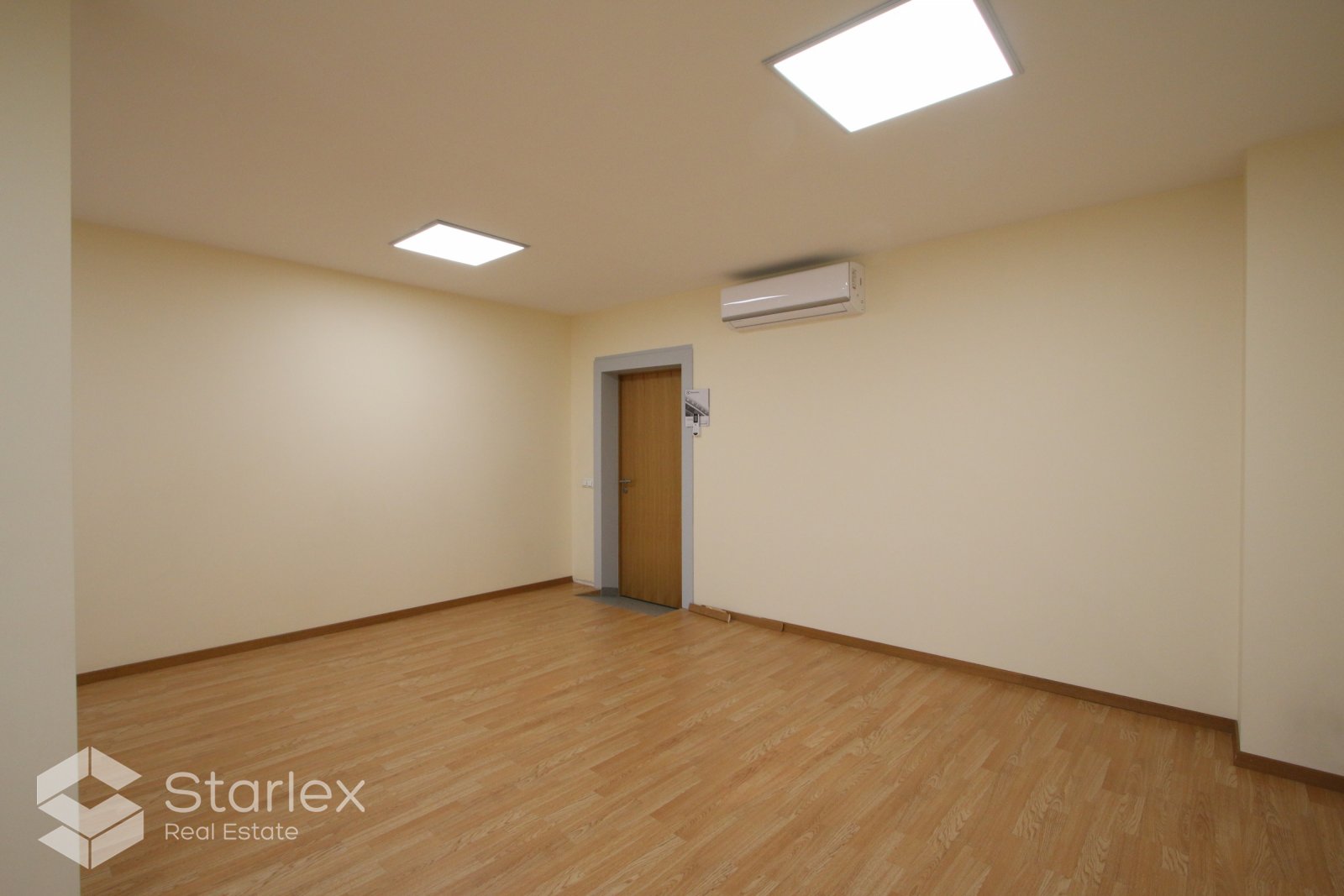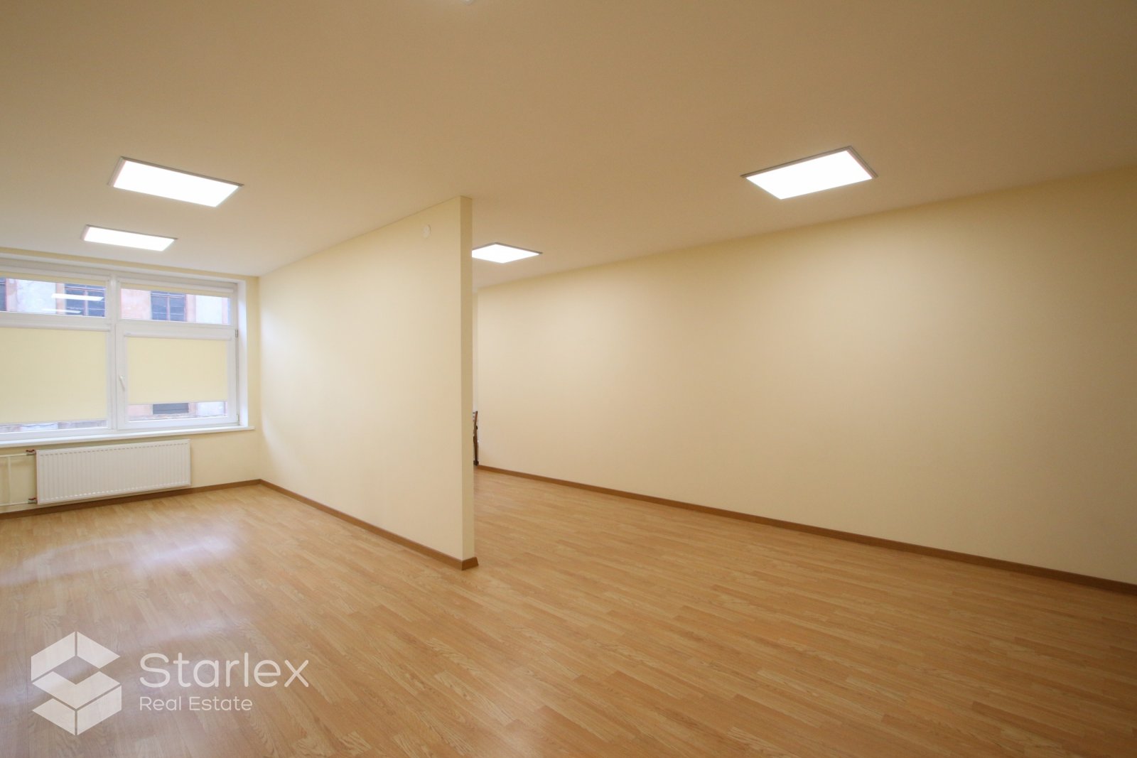 Skats pa logiem vērsts uz Elijas ielas pusi. Birojā uzstādīts kondicionieris, LED apgaismojums.
