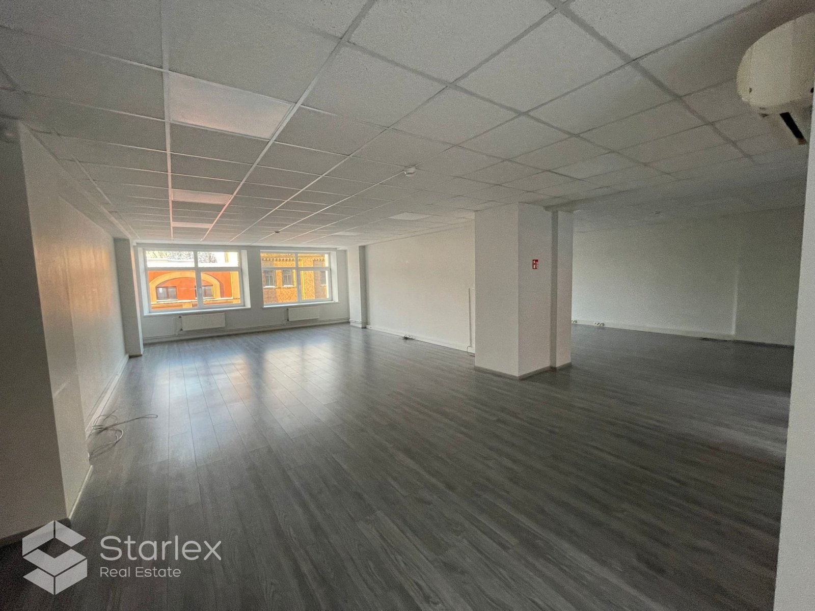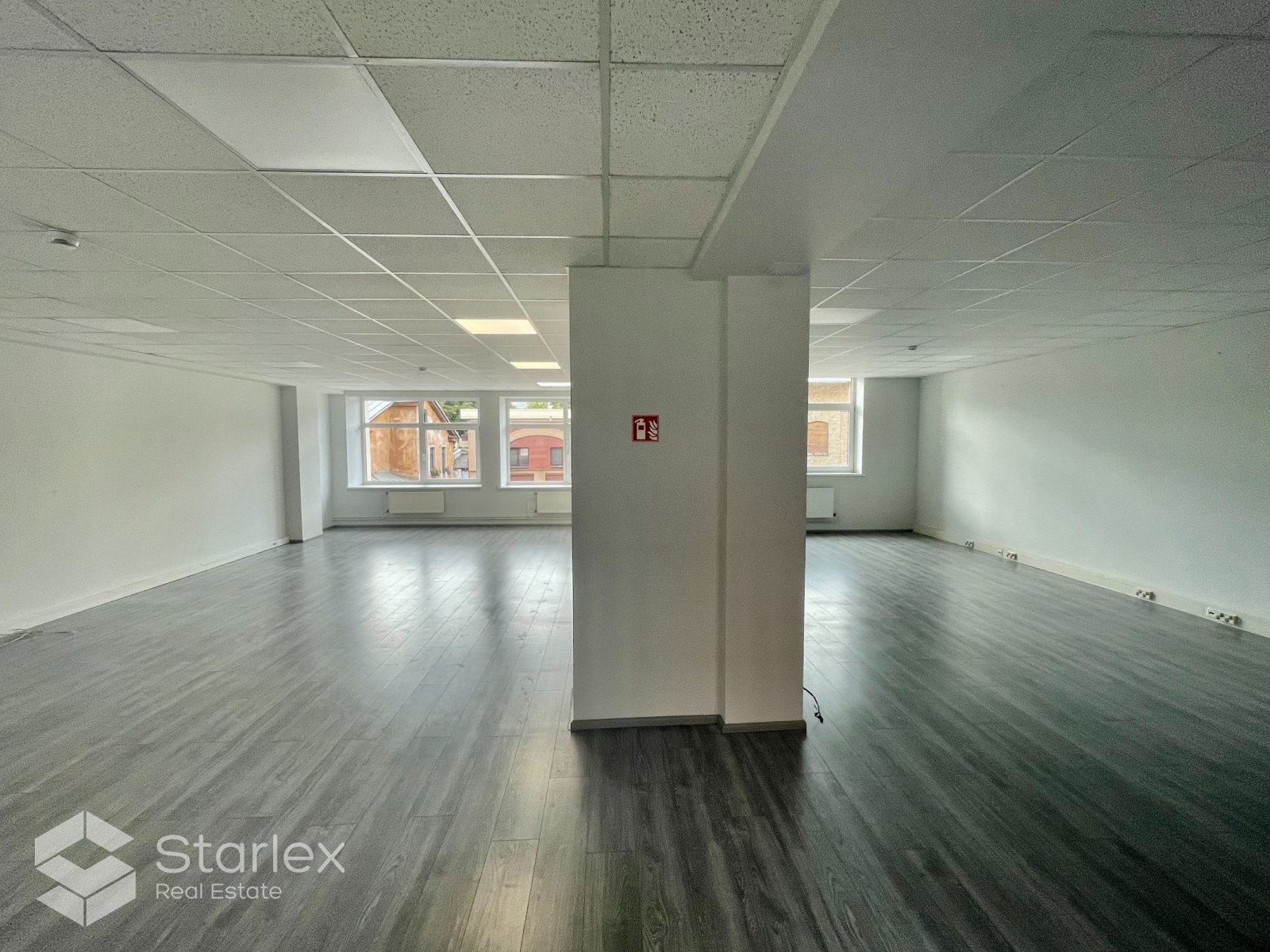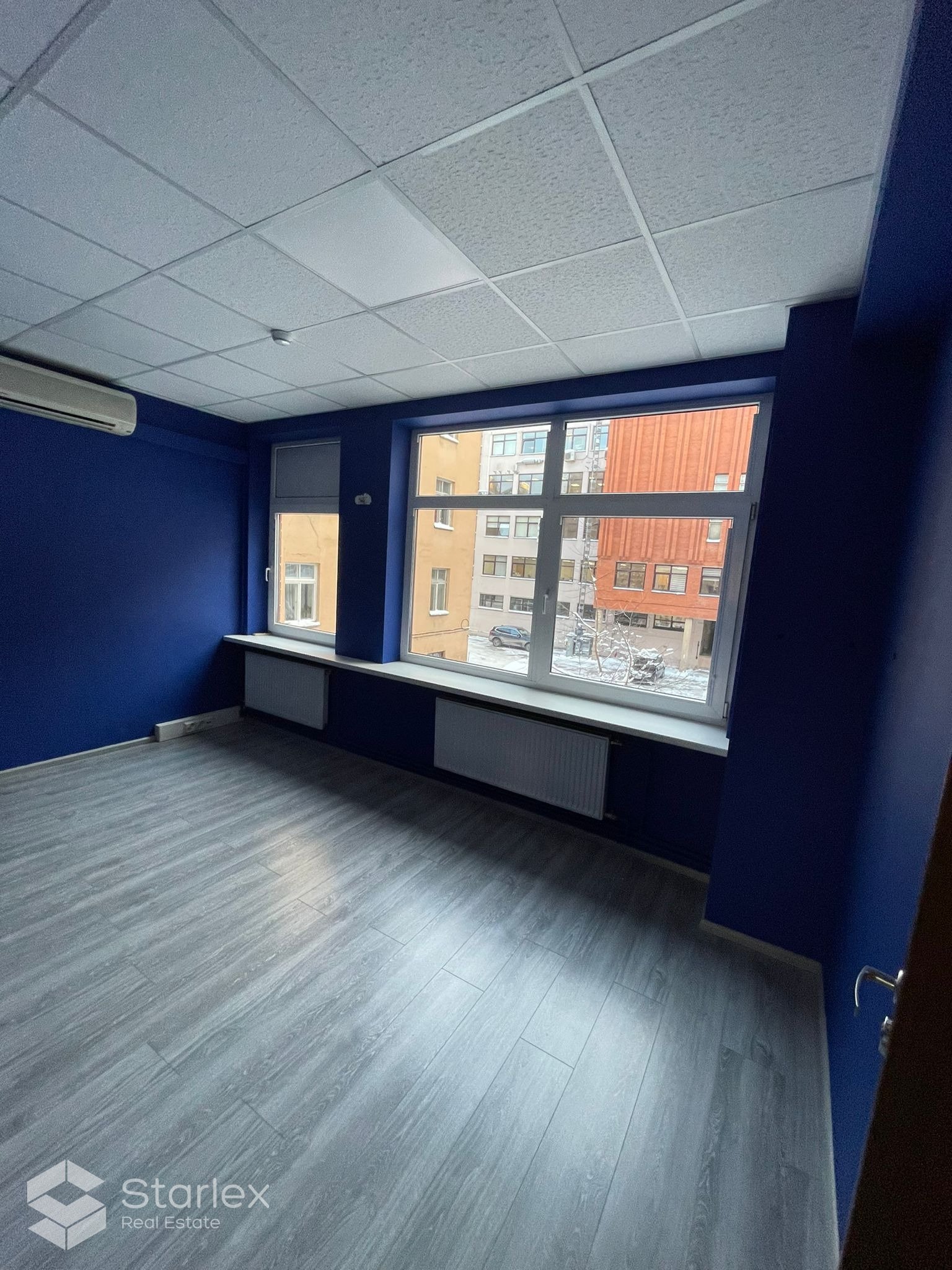Skats pa logiem vērsts uz Elijas ielas pusi un arī uz pagalmu. Birojā uzstādīts kondicionieris, LED apgaismojums.