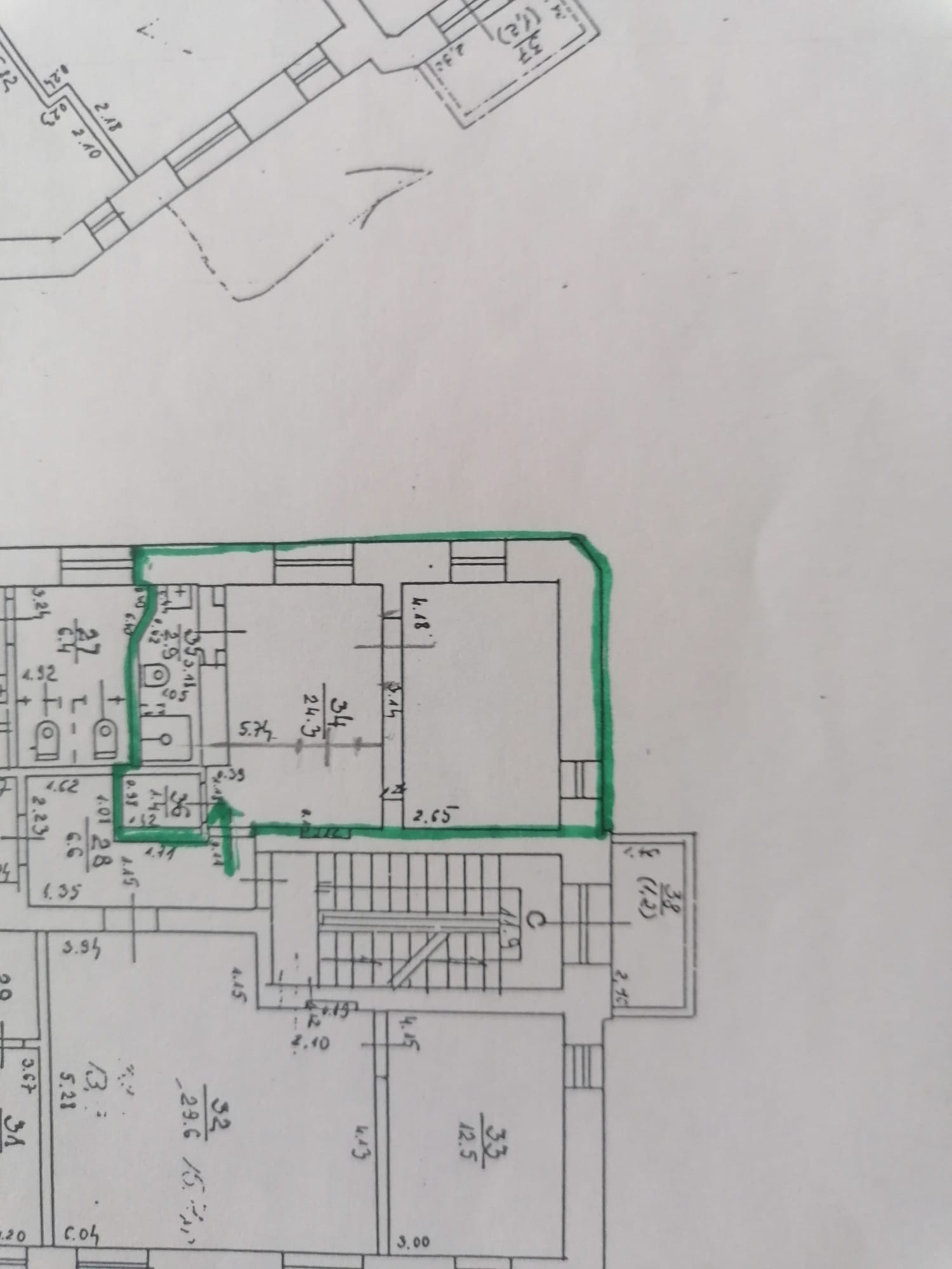 Plānojums: 2 darba telpa, WC koplietošanā ar vairākiem citiem maziem birojiem.