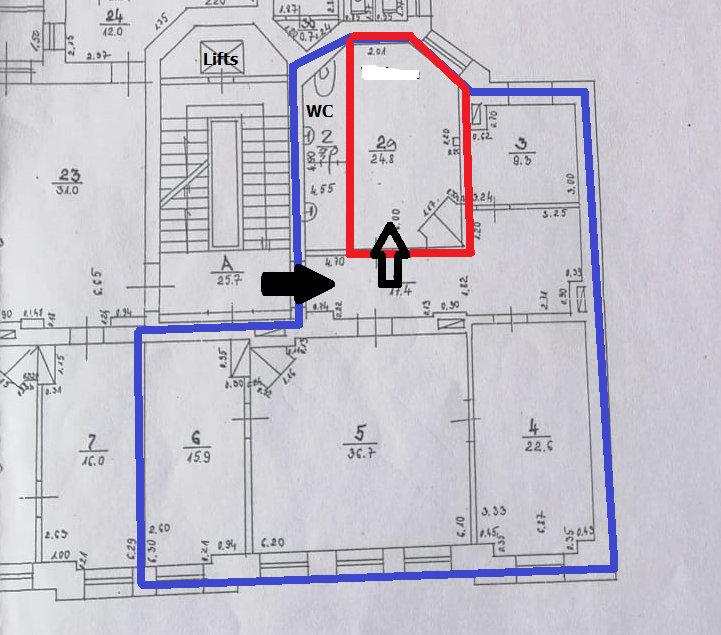Plānojums: 1 darba telpa (logi uz iekšpagalma pusi), koplietošanas WC.