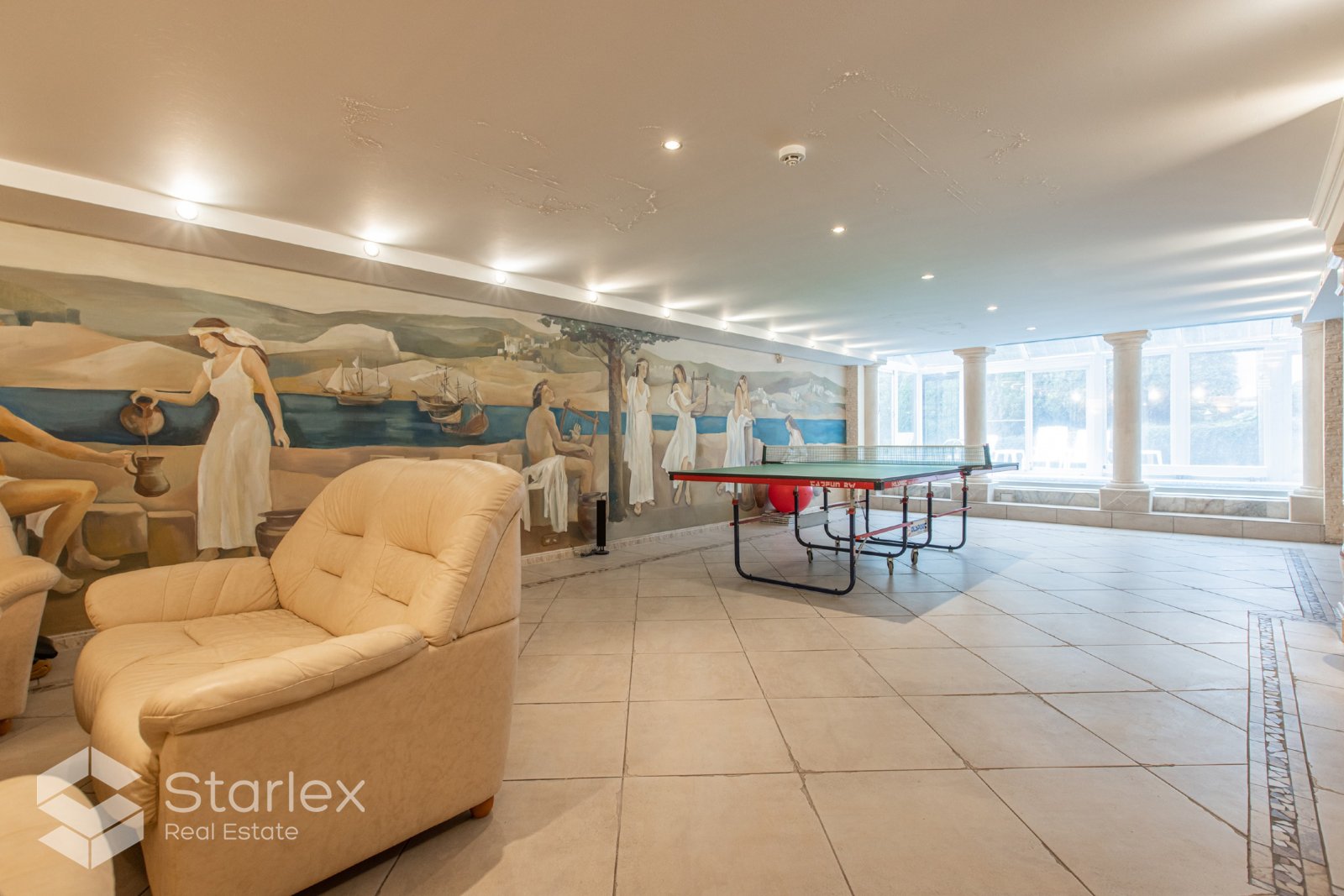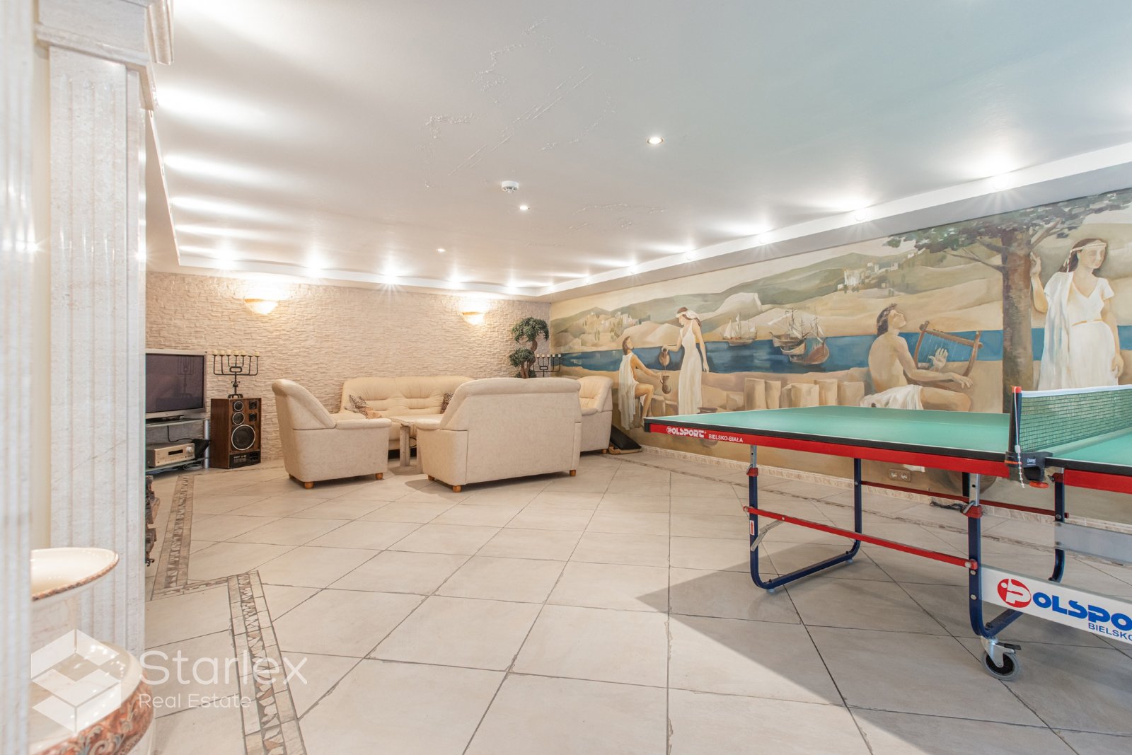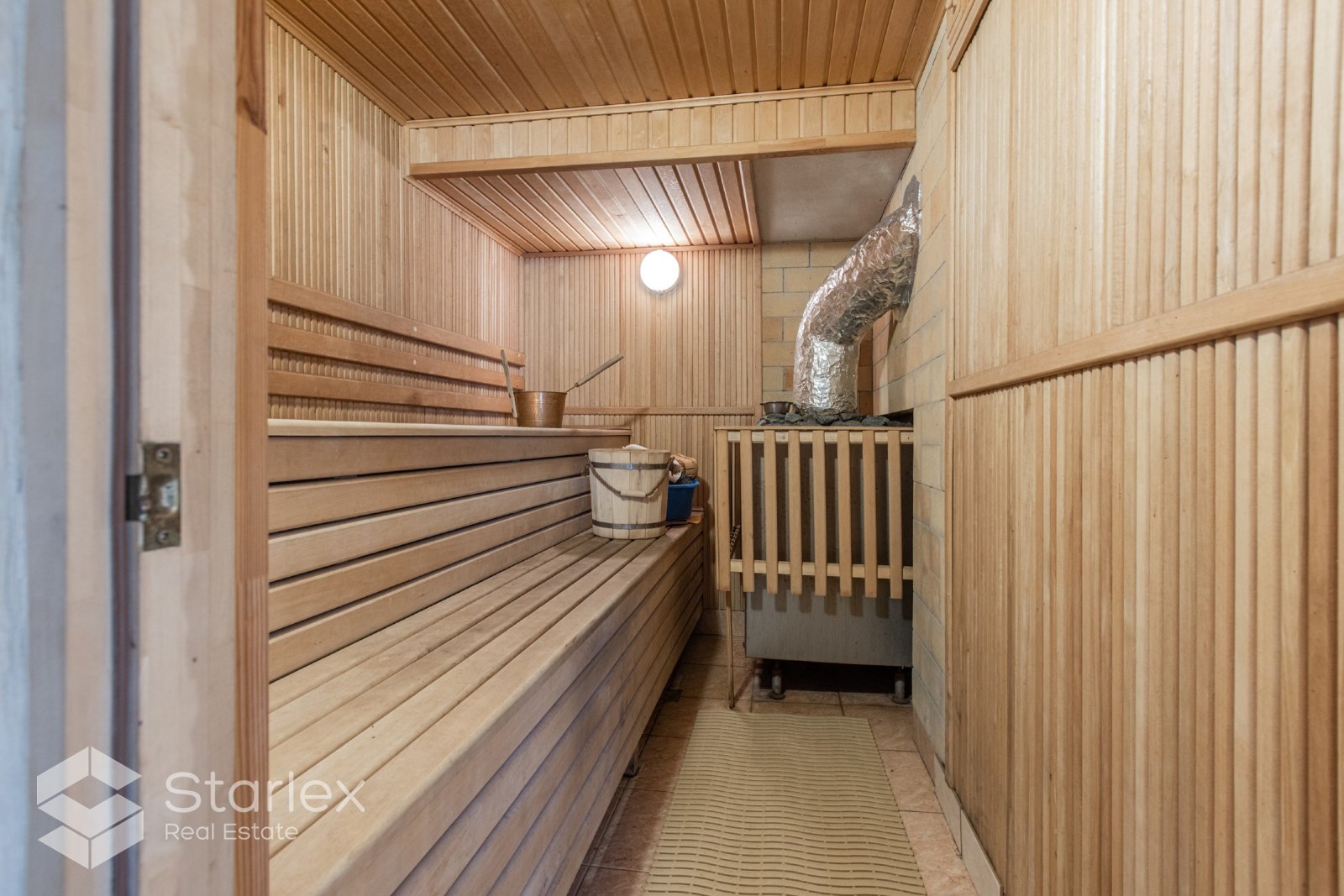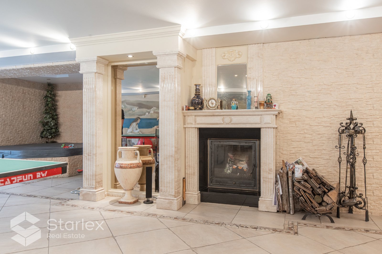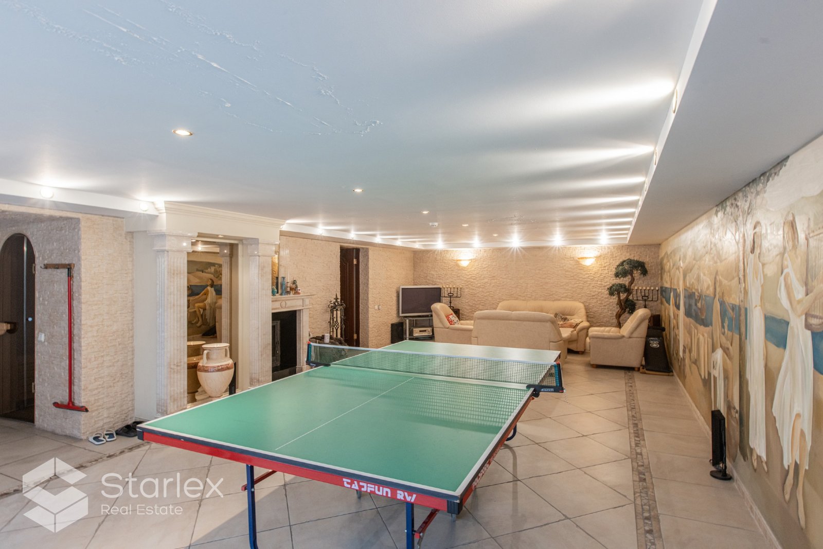 • Plašais pagrabstāvs paredzēts atpūtai pirtī, baseinā, galda spēlēm un pasēdēšanai pie kamīna.