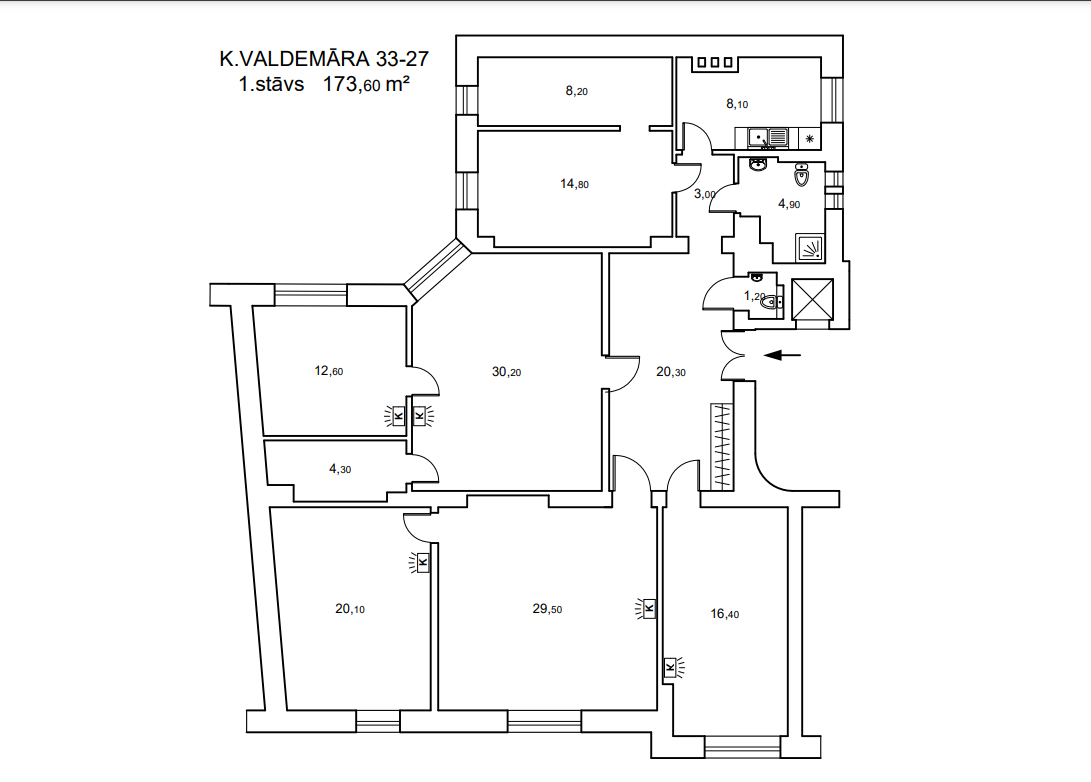 Plānojums: 7 darba telpas (4 izolētas), virtuve, 2 WC.
