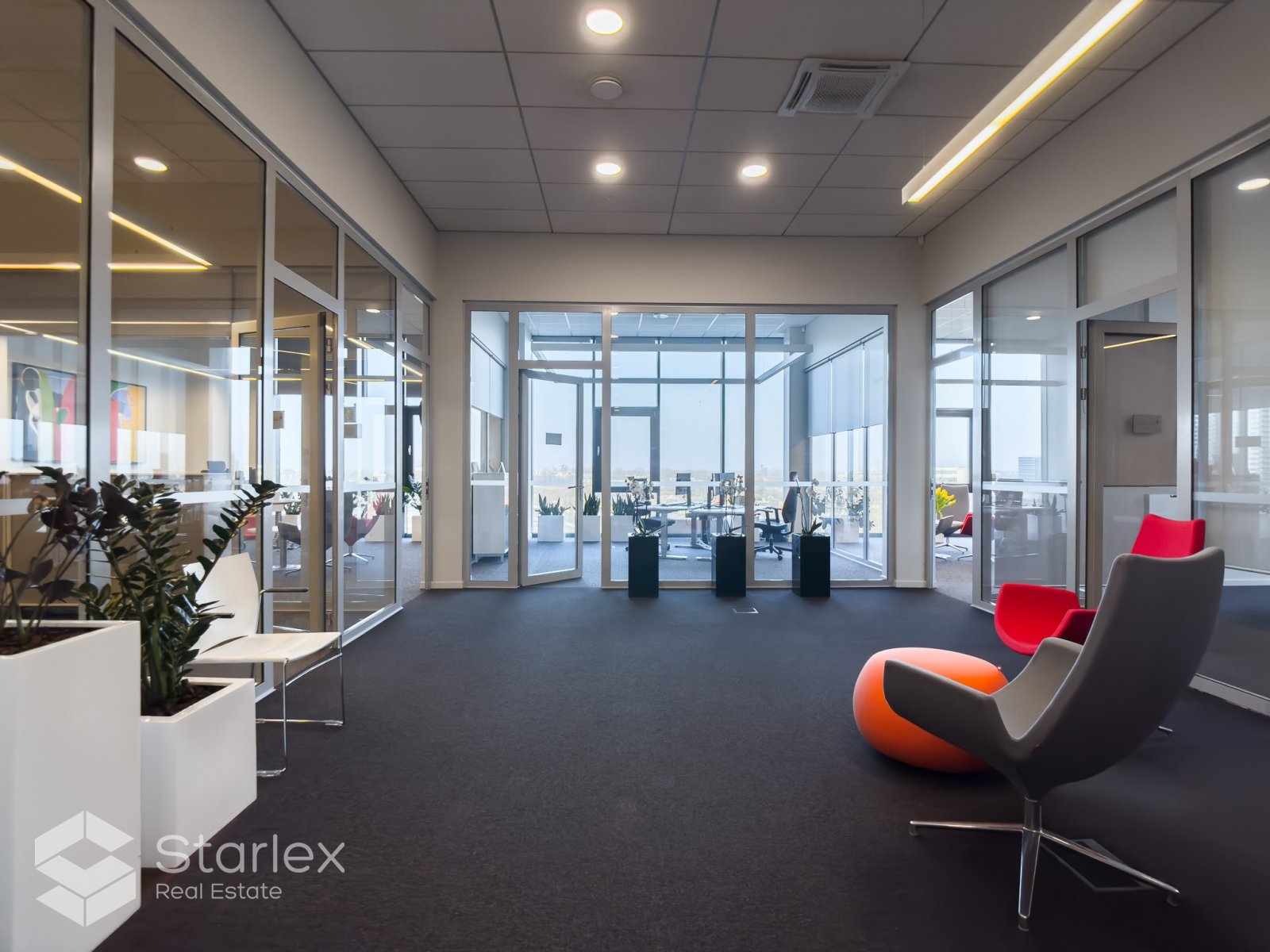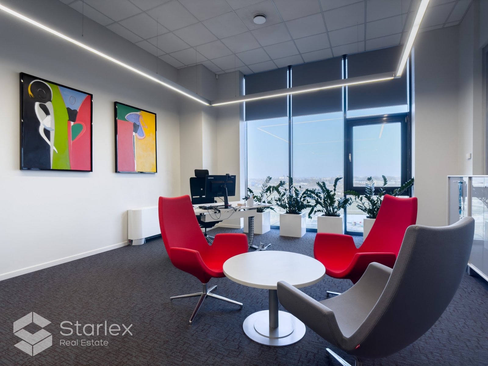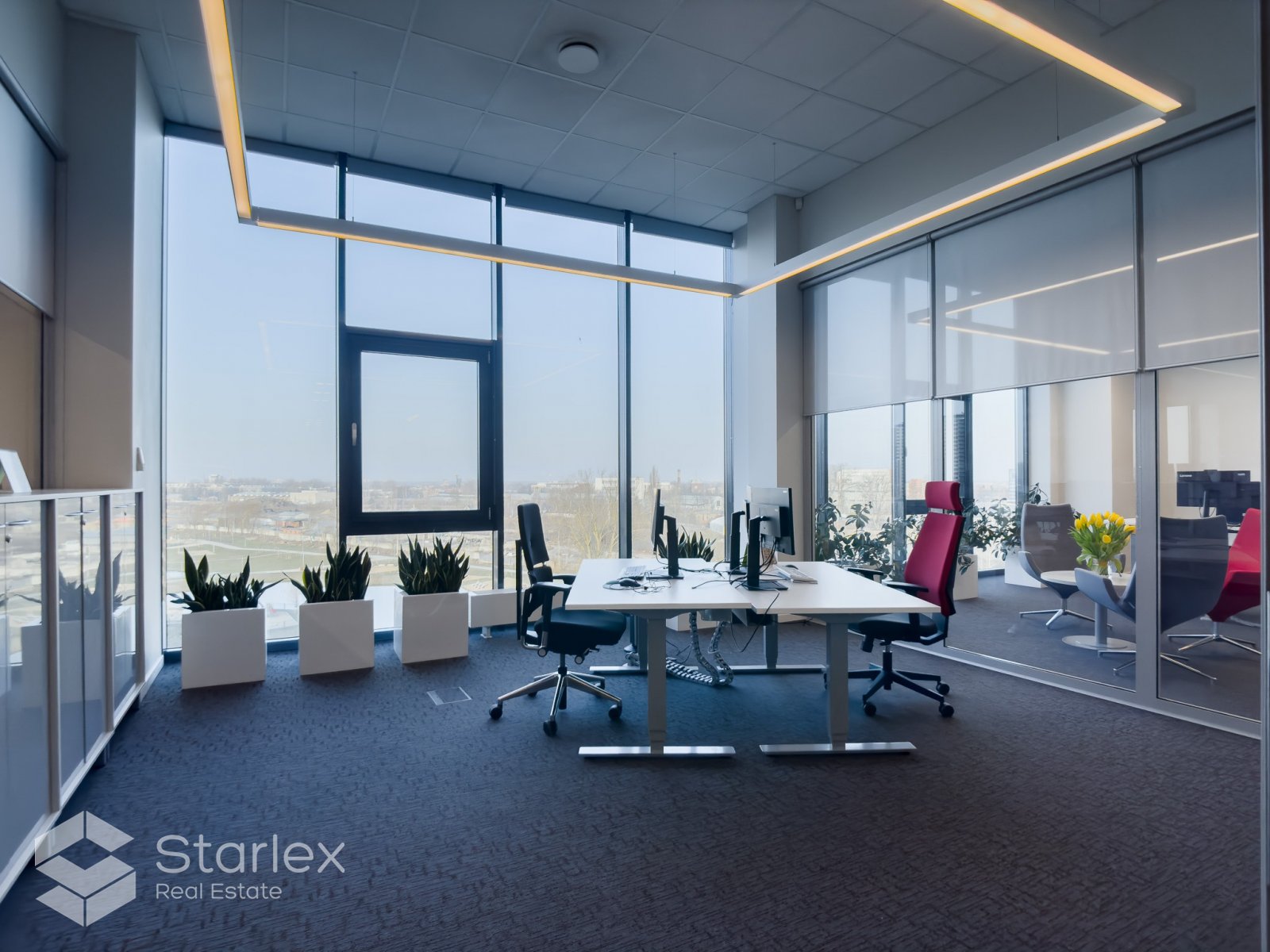 Pilnā apdare. Nepieciešamības gadījumā pārplānojums un iekšējā apdare tiek veikta pēc klienta vēlmēm. Tiek nodots pilnībā gatavs birojs.