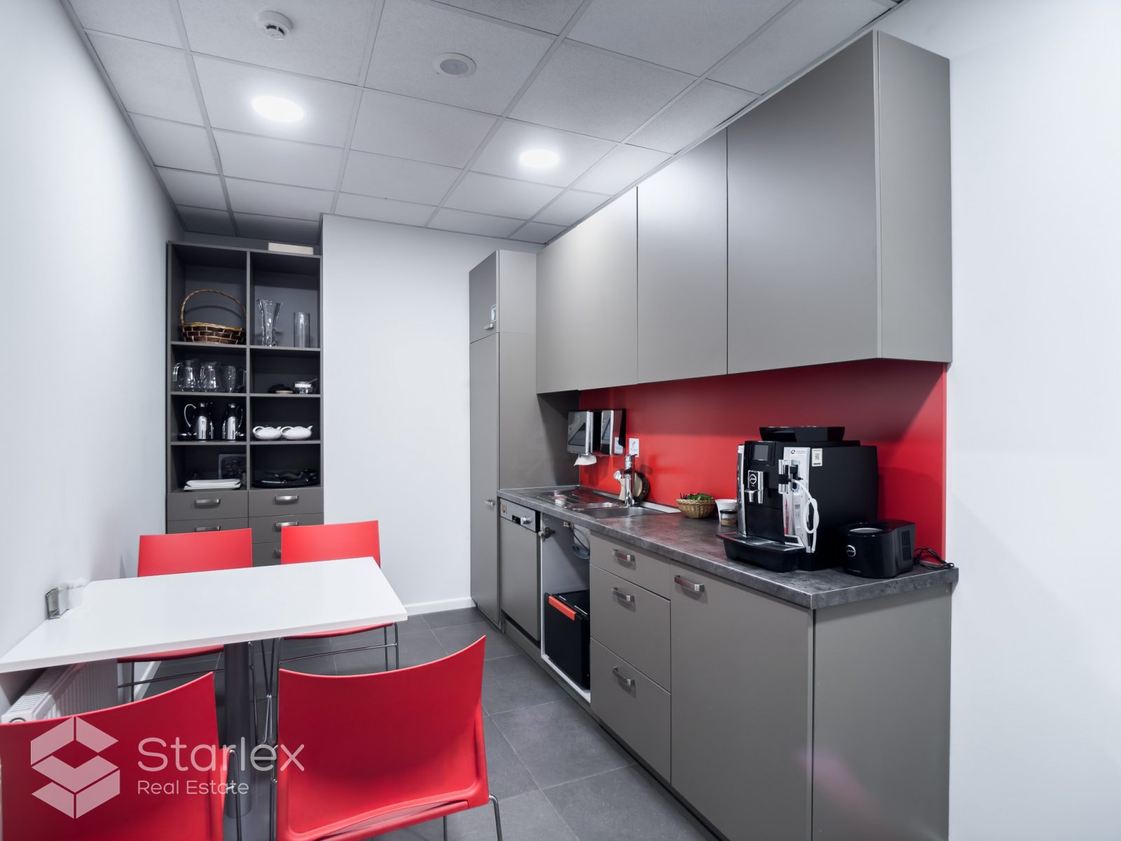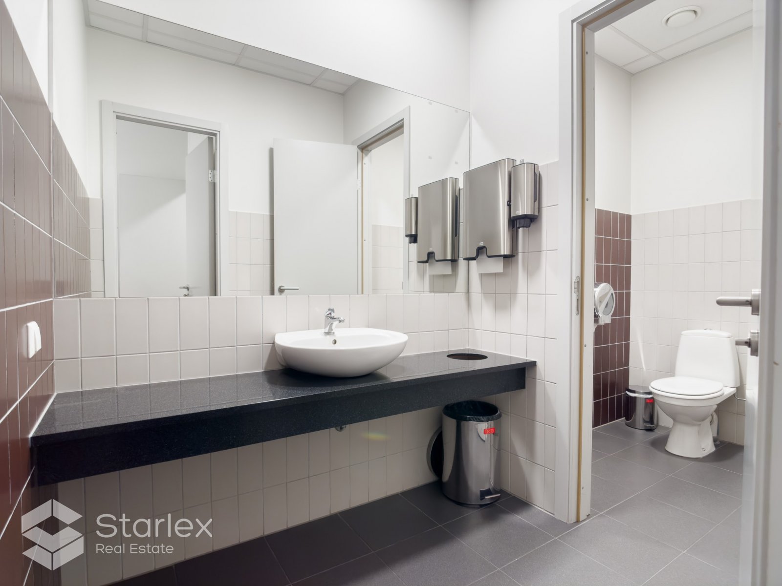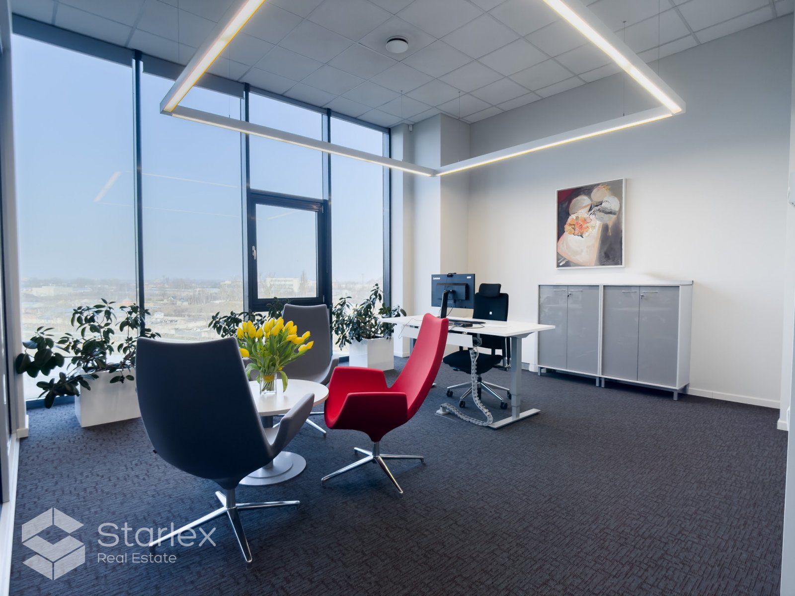 Pilnā apdare. Nepieciešamības gadījumā pārplānojums un iekšējā apdare tiek veikta pēc klienta vēlmēm. Tiek nodots pilnībā gatavs birojs.