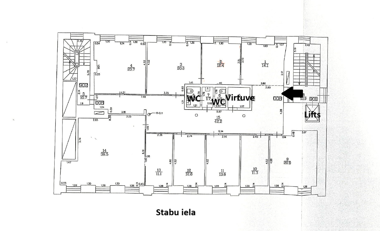 Plānojums: 9 darba telpas (7 izolētas), sekretāres zona pie ieejas birojā, virtuve, 2 WC.